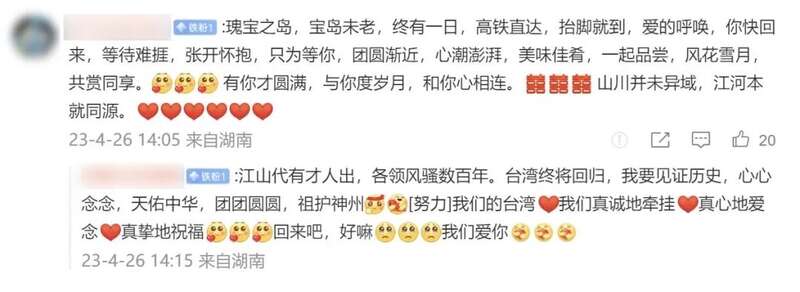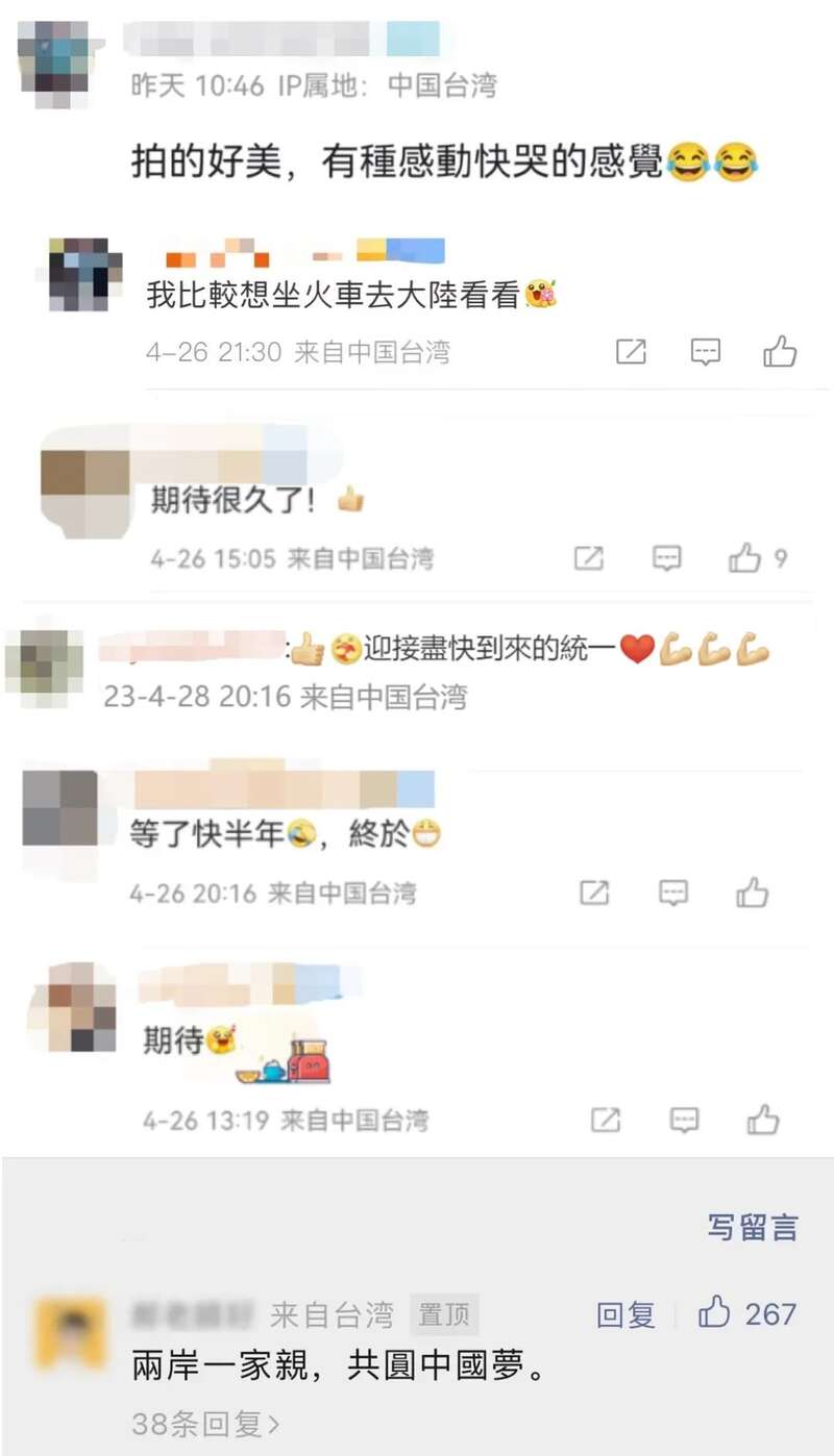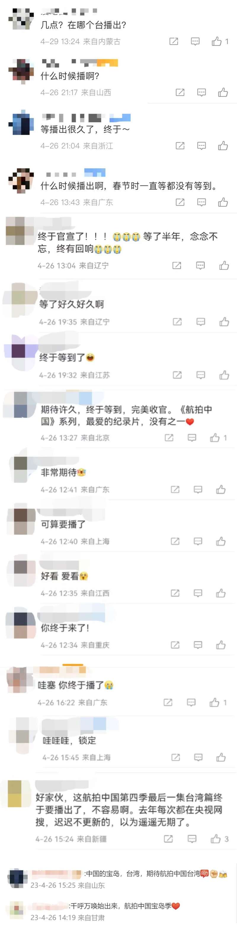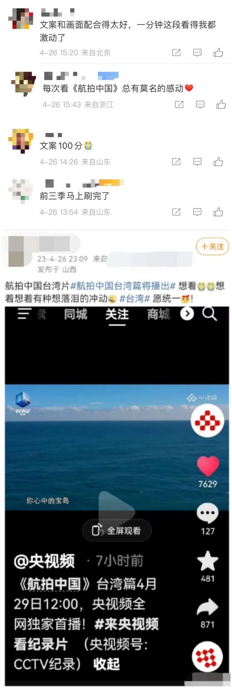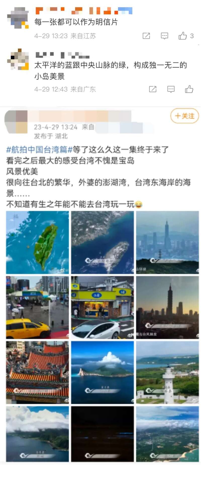 节目官宣定档时,不少网友留言,“期待航拍中国台湾,祝愿祖国两岸统一。”也有网友不住呼唤:“中国台湾,等你归航!”“快归来吧,这里才是快乐老家。”动情之处,更有网友写下了诗一般的留言:“瑰宝之岛,宝岛未老,终有一日,高铁直达,抬脚就到……山川并未异域,江河本就同源。”