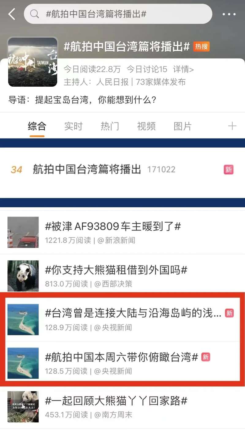 未播先热,《航拍中国》台湾篇在网络上的热度迅速攀升。截至4月29日14时,网络媒体发布了46篇节目相关文章,近2500条微博提及节目内容。《航拍中国》台湾篇15次登上热搜,相关话题阅读总量超1亿:#航拍中国台湾篇将播出# 热搜实时内页第1位、要闻榜第2位,阅读量超3800万次,视频播放量达864万次;#航拍中国俯瞰台湾# 登上要闻榜第3位,阅读量达2316.3万次。