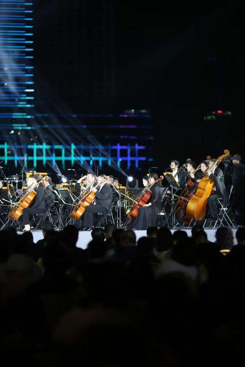 在于家堡滨河公园洲际酒店西侧广场,天津歌舞剧院交响乐团、歌剧团为现场游客上演了一场精彩绝伦的百人交响音乐会,响遏行云的旋律奏响“于响”夜空。