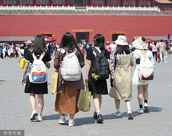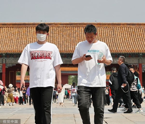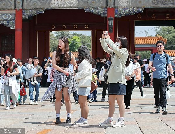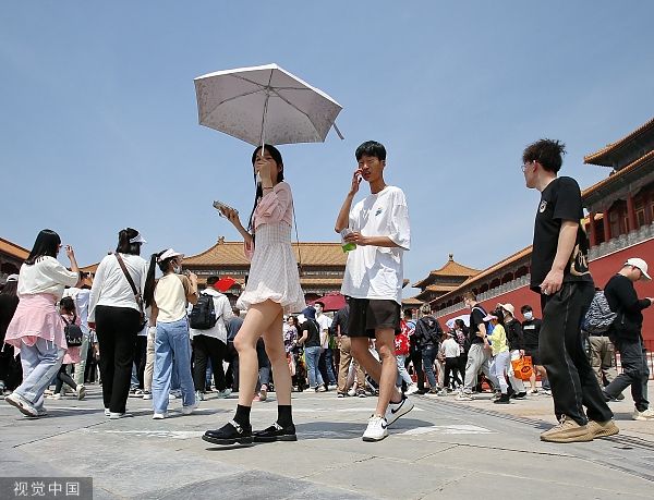 2023年5月1日,北京,游客纷纷换上清凉的服装游览故宫。当日,北京阳光明媚,紫外线照射强烈,最高气温攀升至27摄氏度,恍如初夏一般。在故宫不少游客提前穿上了夏装出行,太阳伞、防晒服、遮阳帽齐上阵抵御紫外线的侵袭。