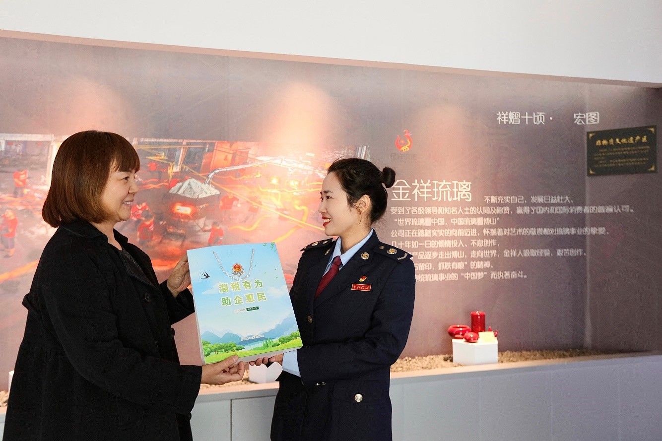 “税务局把优惠政策梳理‘打包’送给我们,我们可以享受的政策以及每项优惠政策该怎么申请办理,都列得清清楚楚、明明白白。”近日收到淄博市博山区税务局青年志愿服务团队上门送去的“淄税有为·助企惠民”税费服务大礼包后,山东金祥琉璃文化艺术有限公司财务负责人徐霞表示。