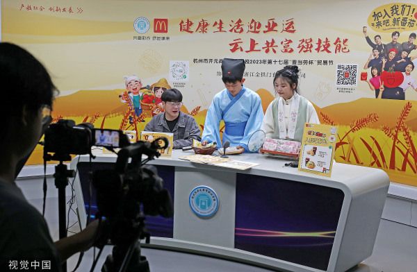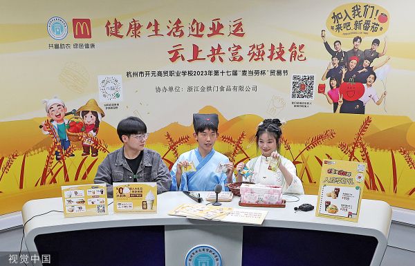 2023年5月6日,杭州市开元商贸职业学校一年一度的校园贸易节正式开启,学生团体分工协作,参与直播导购等电商销售的全流程服务。