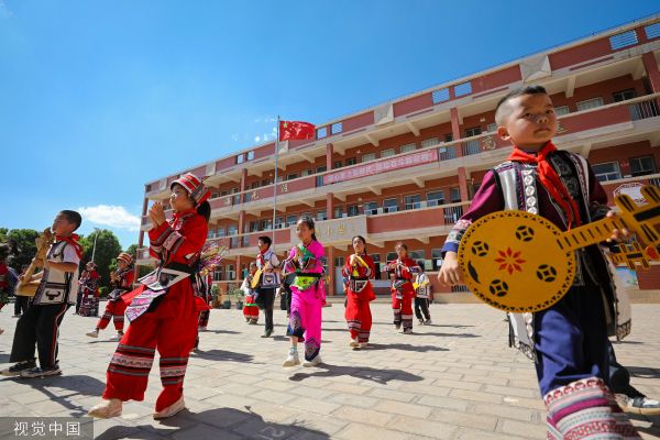 2023年5月5日,云南省曲靖市,陆良县大莫古镇新村街小学在课后服务时间组织同学们排练彝族舞蹈“小三弦”。