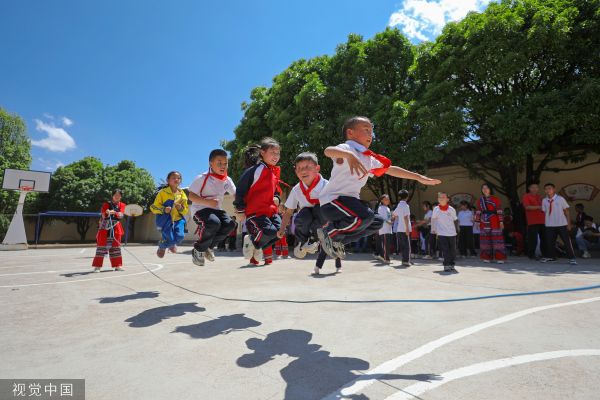2023年5月5日,云南省曲靖市,陆良县大莫古镇新村街小学在课后服务时间组织同学们开展跳绳比赛。
