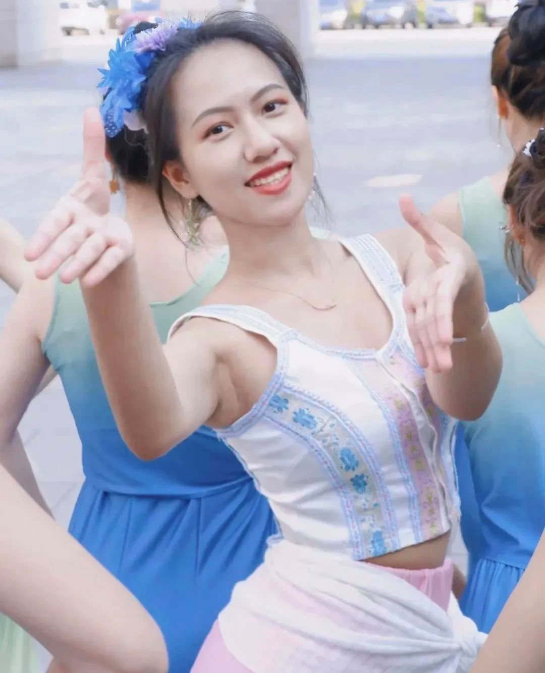 除此之外,张慧玲还带领团队成员进行暑期 “三下乡”社会实践活动,拍摄傣族舞蹈宣传视频,期间自创脚本,自学剪辑。作品上传至社交媒体后,获得校内外广泛关注,该团队最终获得了校级一等奖和校级“优秀团队”的荣誉。在调研期间,他们与云南艺术学院舞蹈学院硕士研究生取得了联系,通过频繁的沟通交流以及资料分享,他们团队创作了一支在动作、音乐、总体风格上都非常适合教学及表演的傣族舞剧目——《勐尤芬芭美》(意为:她在雨林中)。