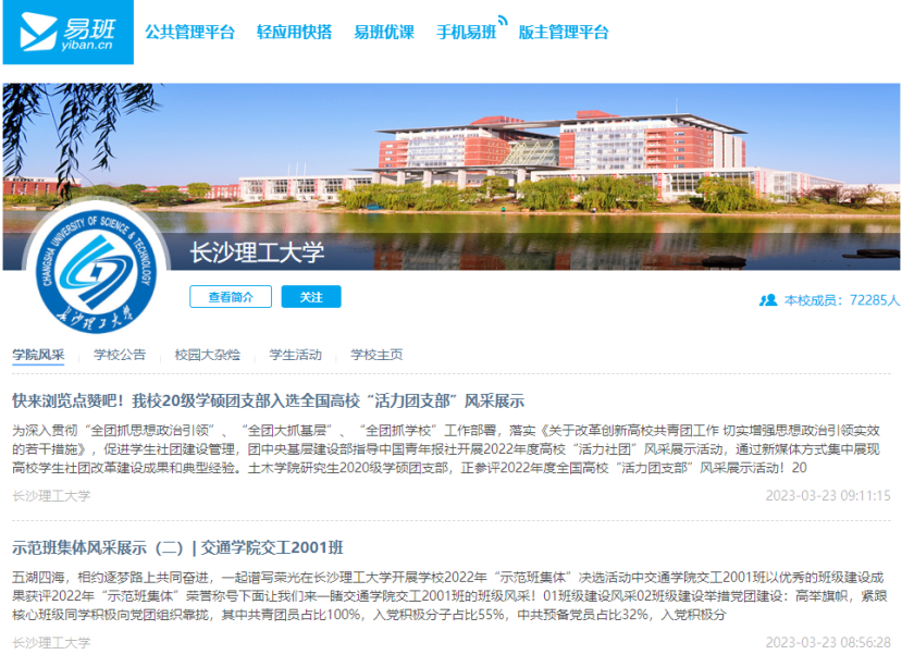 近年来,学校着力构建“三个相结合”的易班立体化内容体系,进一步推动易班与思想引领相结合、与学生日常管理相结合、与校园活动相结合,不断优化立体式网络思想政治教育平台,为网络育人提质增效。截至目前,长沙理工大学易班入驻人数位居全省第一,共建指数长期处于湖南省高校、全国高校前列,易班已成为长沙理工大学网络思想教育主阵地。