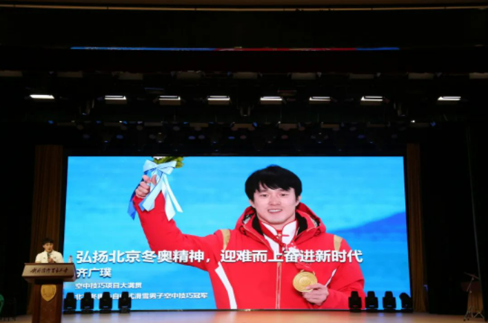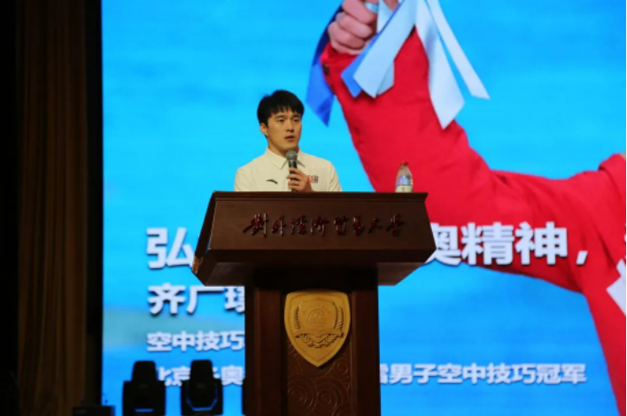 在热烈的掌声之后,中国自由式滑雪空中 技巧大满贯选手齐广璞先生 上台演讲,分享他与滑雪的故事。作为中国最早开展的雪上运动之一,自由式滑雪空中技巧是我国在雪上的“拳头项目”。这个项目,难度系数高、风险系数大,同时又非常考验临场应变、心理调节等多方面因素。日复一日起早贪黑枯燥烦闷的训练,异常艰苦的训练条件,与南方迥异的气候和习惯,无数次在终点前摔倒的无助,他靠着强大的毅力和执着的信念坚守了下来,也完成了一次次的自我超越。伤病是伴随每一个运动员的职业生涯的,在齐广璞的职业生涯中,有过脑震荡,有过腰椎错位,面对伤病,而他把伤病当成了“朋友”,因为每一次的伤病都在促使着他不断变强。三届冬奥会的遗憾更让他有了更好的沉淀,最终璞玉成金,在北京冬奥会完成了大满贯的最后一张拼图。他鼓励青年学子要 不畏困难,勇于挑战 ,实现自我的人生价值。