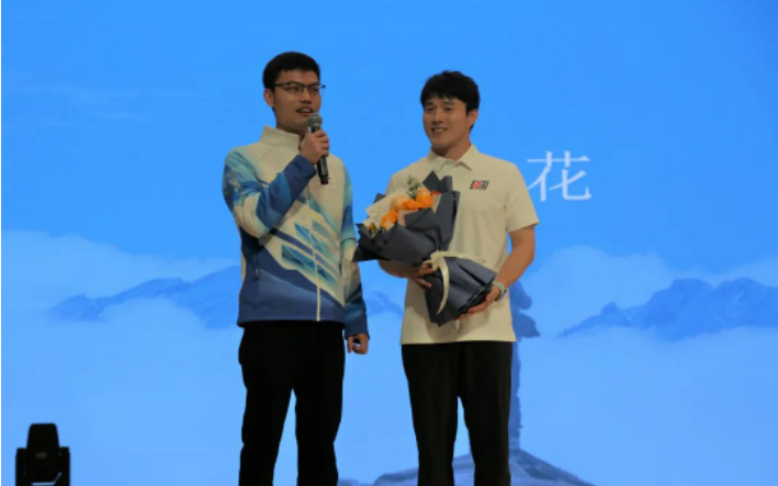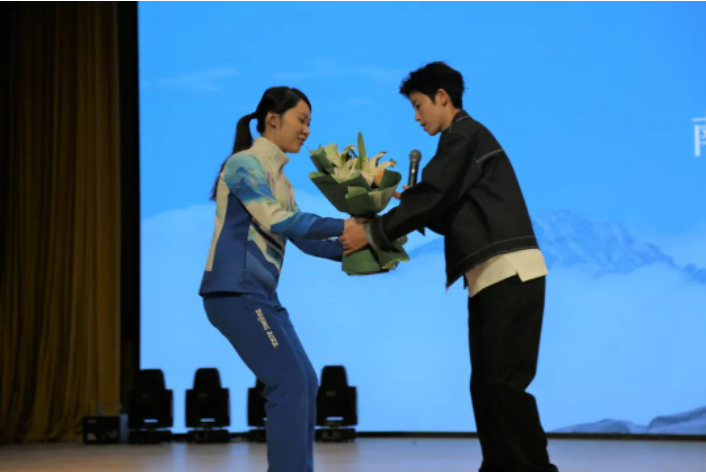 在活动即将进行到尾声之时,冬奥教师志愿者代表闫奕超老师和优秀志愿者代表杨丹妮同学为两位冠军鲜花,真诚地表达了对冠军们的感谢。最后,两位冠军和同学们合影留念,本次活动也在温暖的氛围中落下了帷幕。