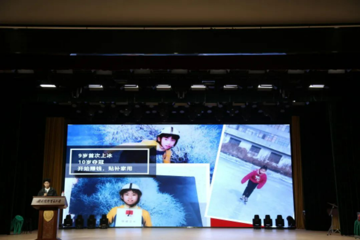 第二位上台的是 世锦赛五冠王、短道速滑大满贯获得者范可新女士 。作为中国短道速滑现役的“一姐”,众人皆看到了她光鲜亮丽的一面,而这些成就背后的辛酸苦楚却鲜有人知。贫穷的压力贯穿了她的童年,但这些在范可新看来都是宝贵的财富,她从未因此而觉得上天不公,而是迎难而上,加倍努力。面对索契冬奥会和平昌冬奥会的遗憾,虽然也曾陷入深深的自我怀疑,但是她用更加拼命的训练去备战。“大家下冰的时候嗓子里都是带血的,可能这就是热血吧”,轻描淡写的一句话道出了数不尽的艰辛与汗水。面对巨大的压力,她始终牢记习总书记的赛前慰问与嘱托,终于成功与队友们为中国体育代表团赢下北京冬奥会首枚金牌,取得“开门红”。正如她在结束演讲时所说的: “长路奉献给远方,岁月奉献给冰场,永远不要怀疑你所热爱的一切。”