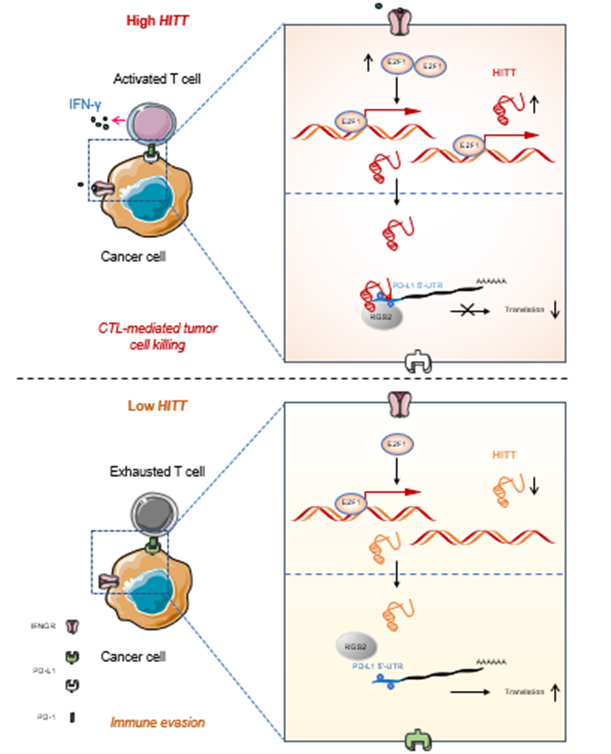 肿瘤细胞内lncRNAHITT抑制PD-L1翻译的机制及其对T细胞免疫的调控作用