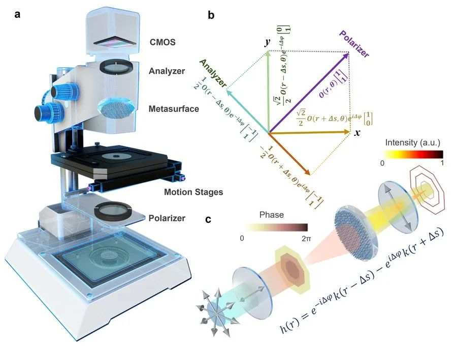 基于超构透镜的各向同性DIC显微镜原理 (a)系统装置图 (b)偏振转换示意图 (c)光学原理图