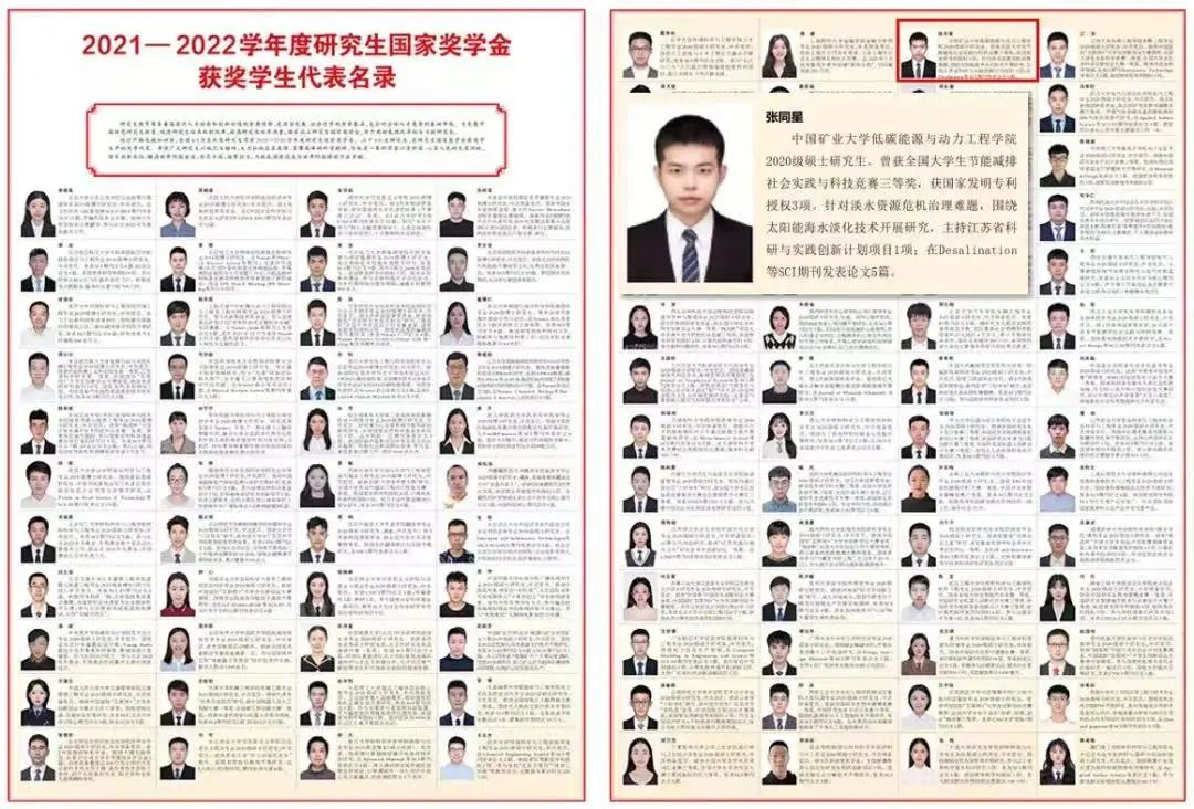5月4日,人民日报发布《2021-2022学年度研究生国家奖学金获奖学生代表名录》,中国矿业大学低碳能源与动力工程学院2020级研究生张同星同学名列其中。