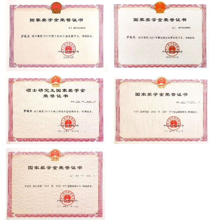 罗俊杰同学获得的国家奖学金荣誉证书