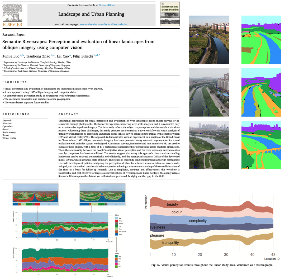 面对这些棘手问题,我们团队创造性地提出利用无人机拍摄一系列全景影像数据,通过计算机视觉技术与虚拟现实技术对大运河的景观特征进行识别与量化分析。最终,我们的研究取得了非常好的效果,研究成果《Semantic Riverscapes: Perception and evaluation of linear landscapes from oblique imagery using computer vision》也发表在了城市规划与风景园林行业顶刊Landscape and Urban Planning(中科院1区TOP)。
