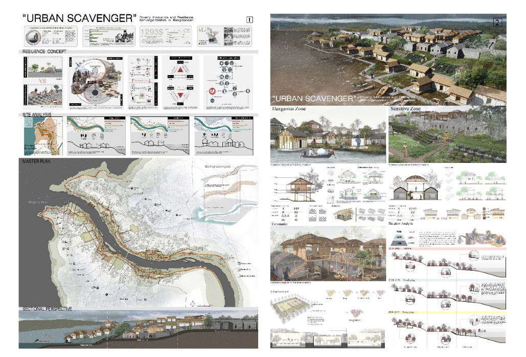 在面对贫穷落后,无法大规模使用现代化防洪设施抵御洪水的现实条件下,我们运用批判思维,合理分析现状问题,构建思维导图,大胆提出“自下而上,低技创新”的设计理念,合理构建洪水缓冲区,运用了多项“自下而上”的创新措施抵御洪水,最终我们的方案赢得了IFLA国际景观设计大奖。