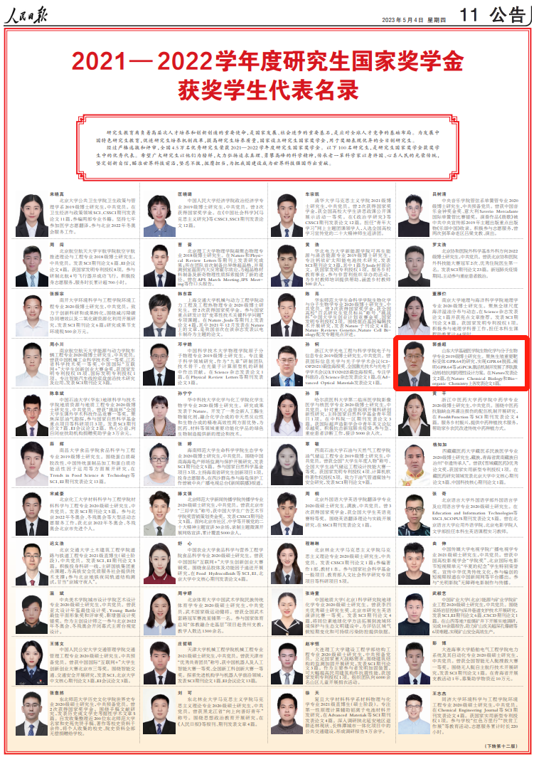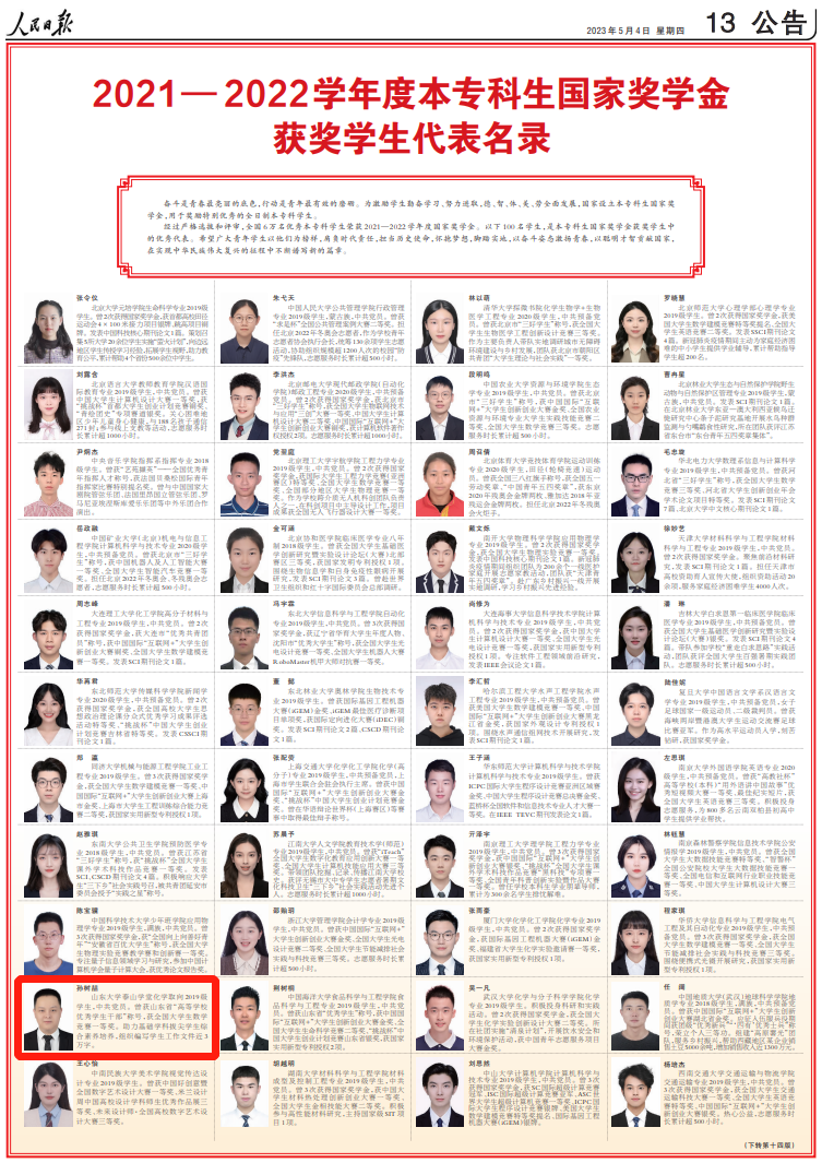 山东大学泰山学堂(教育部基础学科拔尖学生培养基地)化学取向2019级本科生,汉族,中共党员。现任泰山学堂学生党支部负责人、班长。曾获国家奖学金、宝钢优秀学生特等奖、济南奖学金;“山东省高等学校优秀学生干部”“山东大学十佳班长”“山东大学十佳共青团员”称号;全国大学生数学竞赛国家一等奖。坚持学术导向,负责国家级大学生创新创业项目1项,优秀结项。专注学科前沿,围绕手性内酰胺的不对称合成开展研究、参加分析化学课程教学改革,发表SCI期刊论文1篇(影响因子8.455/中科院一区),中文科技期刊数据库(全文版)收录论文3篇。助力基础学科拔尖学生综合素养培养,组织编写学生工作文件近3万字。