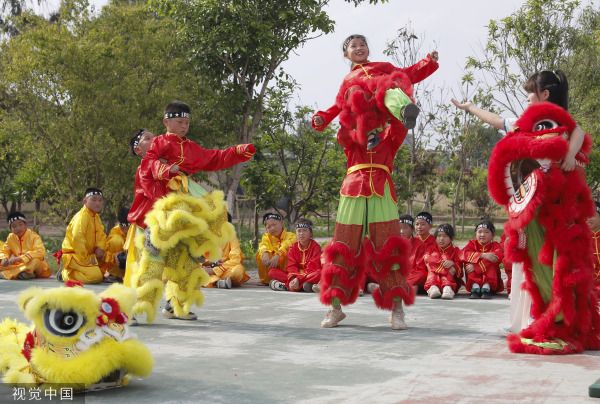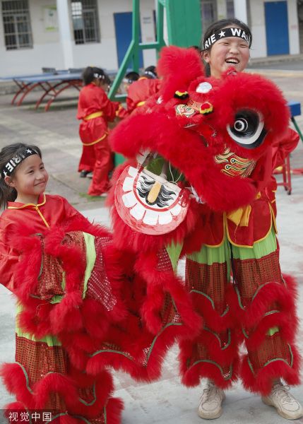 2023年5月9日,江西吉安,吉州区曲濑镇长乐小学,这是舞狮队队员。