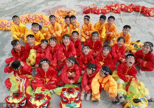 2023年5月9日,江西吉安,吉州区曲濑镇长乐小学,这是舞龙舞狮队全体队员。