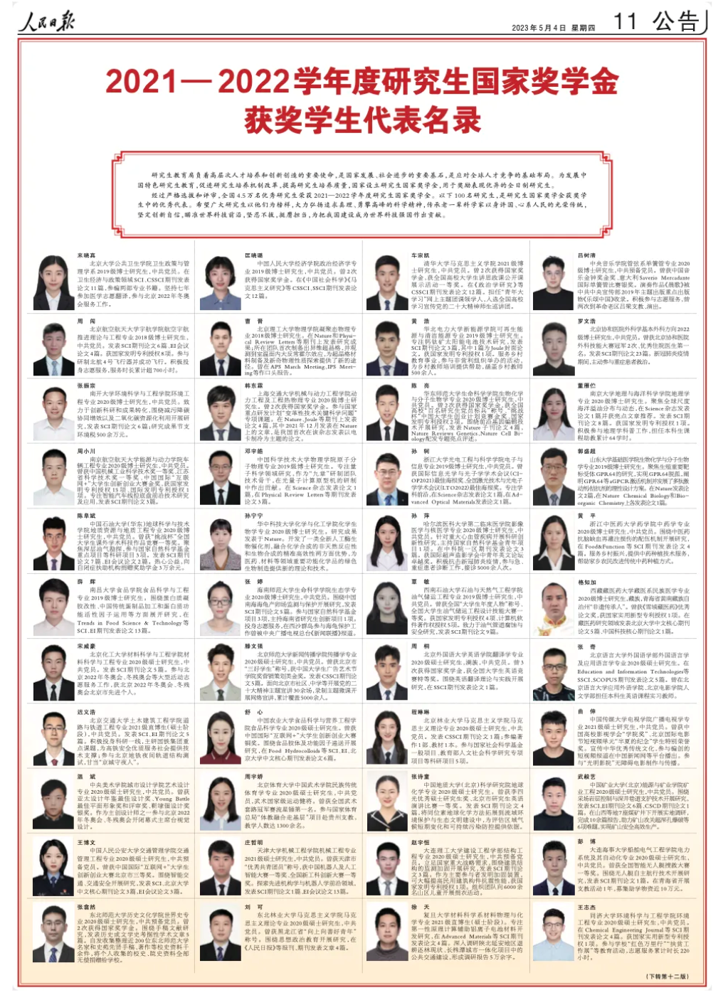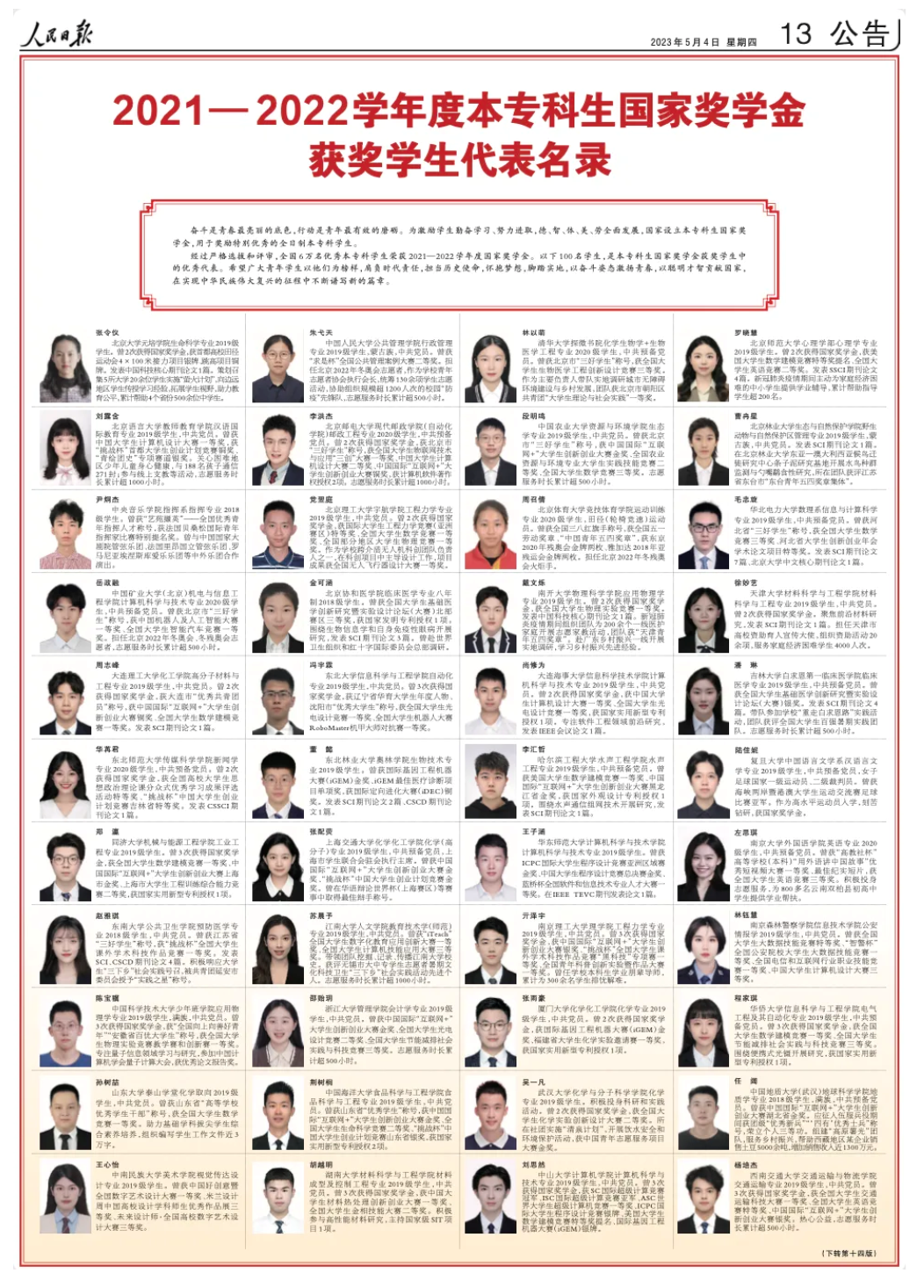 5月4日,五四青年节之际,《人民日报》整版刊登2021-2022学年度国家奖学金获奖学生代表名录,交大学子韩东霖(机械与动力工程学院2020级博士研究生)、张配荧(化学化工学院2019级本科生)光荣上榜。