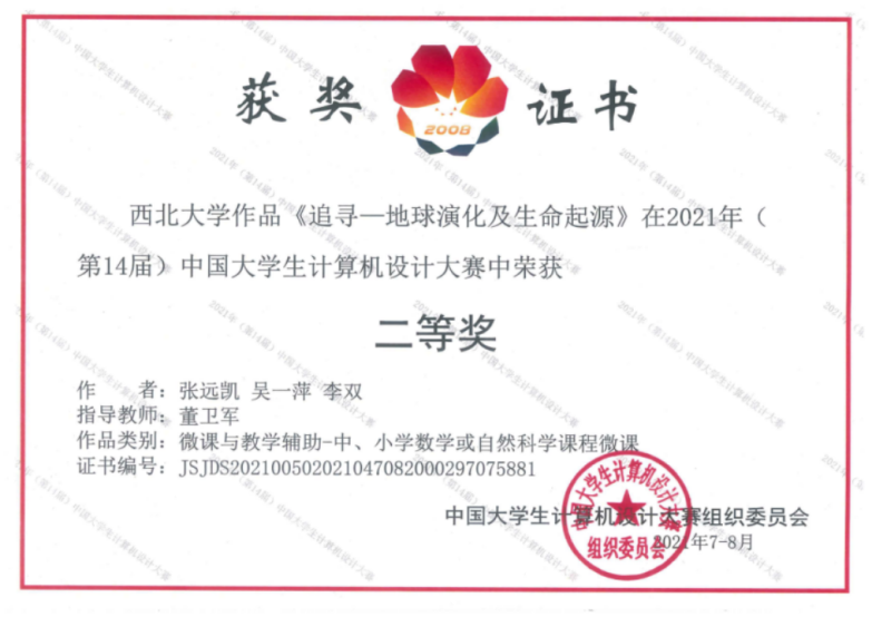 前年,张远凯与本专业同学组建队伍,围绕着探索原始地球发展与演变过程制作完成了动画作品《追寻-地球演化及生命起源》,并获大学生计算机设计大赛国家二等奖。