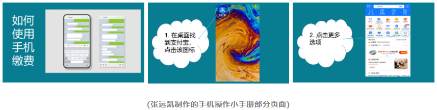 调研期间,他发现智能手机在村里的覆盖率大幅提升,但在“数字鸿沟”的极化效应下,一众留守老人始终难以掌握手机的功能性使用,程度好的仅限于最基础的接打电话。为了缓解问题,张远凯当即编写了手机操作小手册,以“手机图标索引”的方式在册中详细地记录了部分功能的使用方法,并为村里老人当面讲解说明。