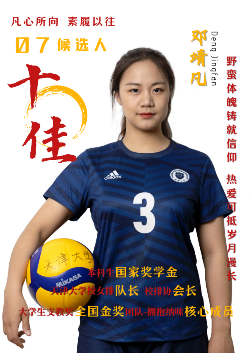 事迹精要:校女排队长、校排协会长、天津大学常任学生代表、院球队负责人、朋辈导师等 20+身份;国家竞赛奖5项、论文2篇;国家奖学金、校金牌讲师等 30+奖项;纳咪、宕昌共5段支教。20000+字实事求是的提案,1100+小时对山区孩子的陪伴,140+场活动的举办……5载北洋时光,只为诠释一份热爱与真心。