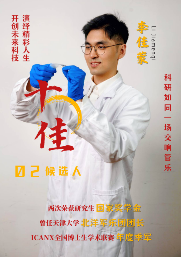 事迹精要:从事生物医学柔性电子领域研究,主导国防科技创新项目两项,累计发表SCI论文12篇,其中以第一作者发表SCI 1区3篇,2区2篇,发明专利三项;两次获得研究生国家奖学金,多次获得天津大学先进个人;ICANX全国博士生学术联赛年度季军;曾任天津大学北洋艺术团人事团长,北洋军乐团团长、学生指挥,曾获天津市文艺展演一等奖,雅马哈之星器乐大赛第一名。