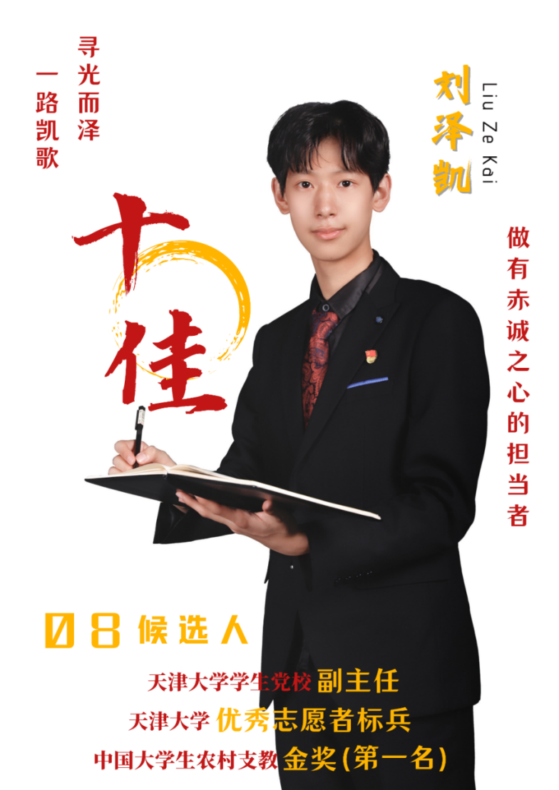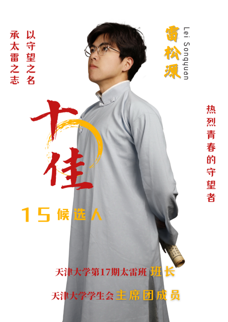 事迹精要:曾连续担任天津大学学生会主席团成员,本科毕业赴甘肃宕昌支教一年。现任班级党支部书记、第17期太雷班班长。他将服务同学的初心从学校带到西部,再将服务西部的情怀从西部带回校园,用热爱续写天大青年的责任担当。
