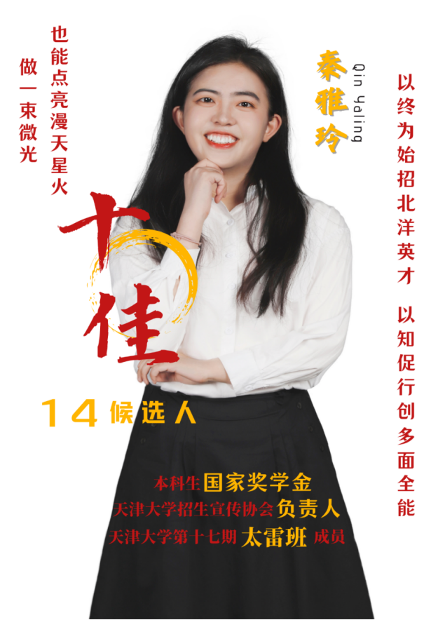 事迹精要:现任第十七期“太雷班”成员,第五届招生宣传大使团成员,曾任天津大学招生宣传协会负责人、建工学生团建中心书记、建工学院兼职辅导员等十余项学生工作,辅修财务管理双学位,曾获国家奖学金、建工学院十佳青年等 30 余项荣誉,相关事迹经人民网、中国青年报、天津日报、天津大学等官方媒体报道,累计阅读量 30w+。