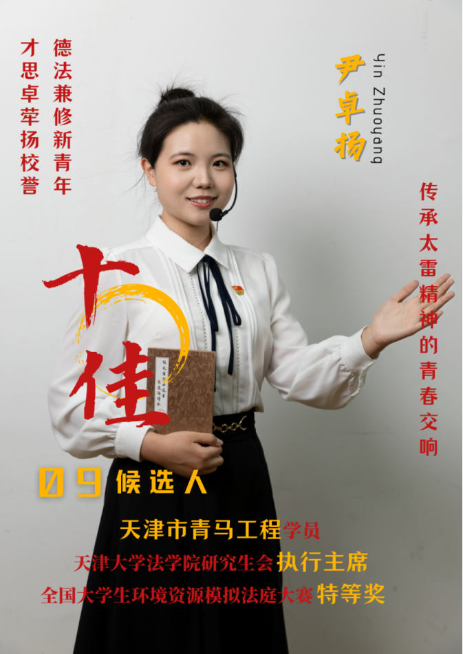 事迹精要:加权成绩专业第2,代表天大首获全国环境资源模拟法庭大赛冠军,校级以上荣誉累计30余项。作为天津大学学生党史宣讲团讲师、第十六期太雷班学员,面向全国宣讲太雷精神,获新华网专篇报道,成为唯一受邀出席全国馆校合作联盟首届年会的“金牌”学生讲解员。团市委办公室实习,甘肃省宕昌县支教,身肩天津市青马工程学员、天津大学兼职辅导员、学生电视台新闻工作室主任、院研会执行主席等10余项工作,用心用情服务天大师生、践行太雷精神。