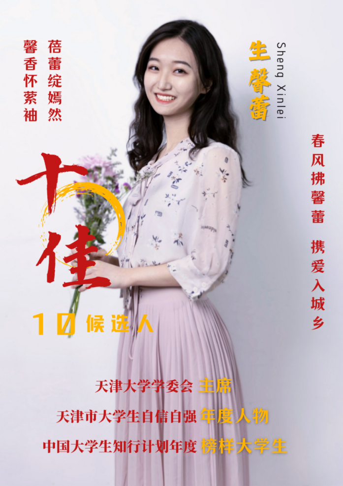 事迹精要:她是七登天大官微的“天大姑娘”、2022年度优秀学生表彰大会上的青春励志宣讲人;她是天津市大学生自信自强年度人物获得者、“中国大学生自强之星”校级推荐人。她将实践力行深入到爱家国、爱城乡、爱北洋、爱新生、爱生活的方方面面。是弘扬传统,焕活文化;是学以致用,改造城乡;是脚踏热土,拥抱乡村;是助学助困,赤诚奉献;是不被定义,多元发展。脚踏实地,求真万里,做想人民所想、解人民所需的新时代规划师,她用实践、用奉献书写有关馨蕾爱的故事。