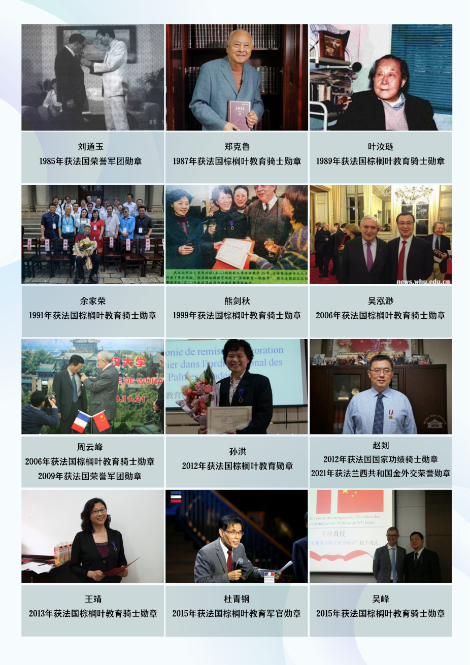 刘道玉、郑克鲁、叶汝琏、余家荣、熊剑秋、吴泓渺、杜青钢、周云峰、赵剡、孙洪、王靖、吴峰……从1985年到2022年,武汉大学共有12名教师获得法国政府颁发的“法国荣誉军团勋章”“法国棕榈叶教育勋章”“法国国家功绩勋章”及“法兰西共和国金外交荣誉勋章”等14枚各类荣誉勋章。从凯旋门到老斋舍,一位位躬耕者搭建起中法交流的桥梁,闪耀的勋章见证他们的奉献。