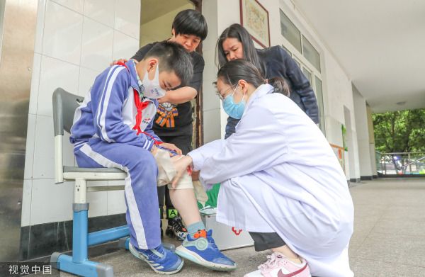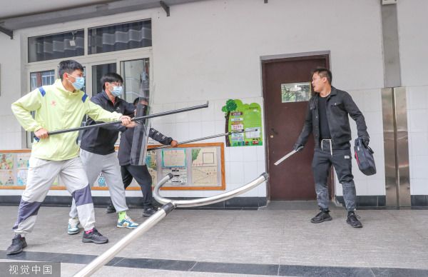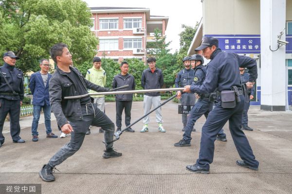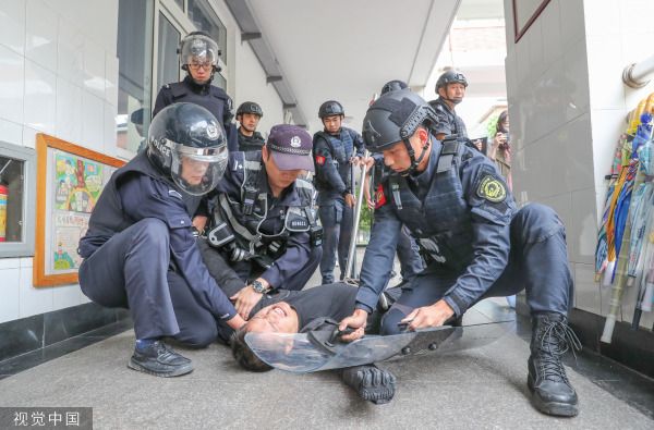2023年5月11日,浙江湖州,德清县实验学校反恐防暴演练中,派出所民警联手特警制服持刀“歹徒”。