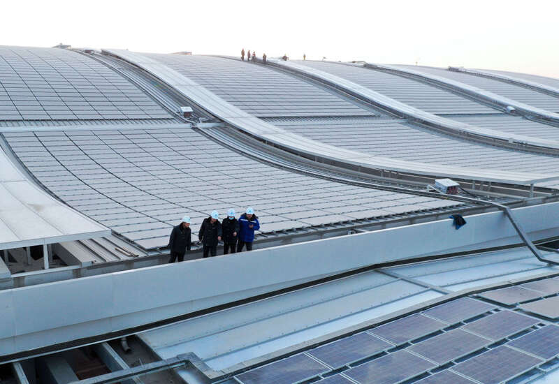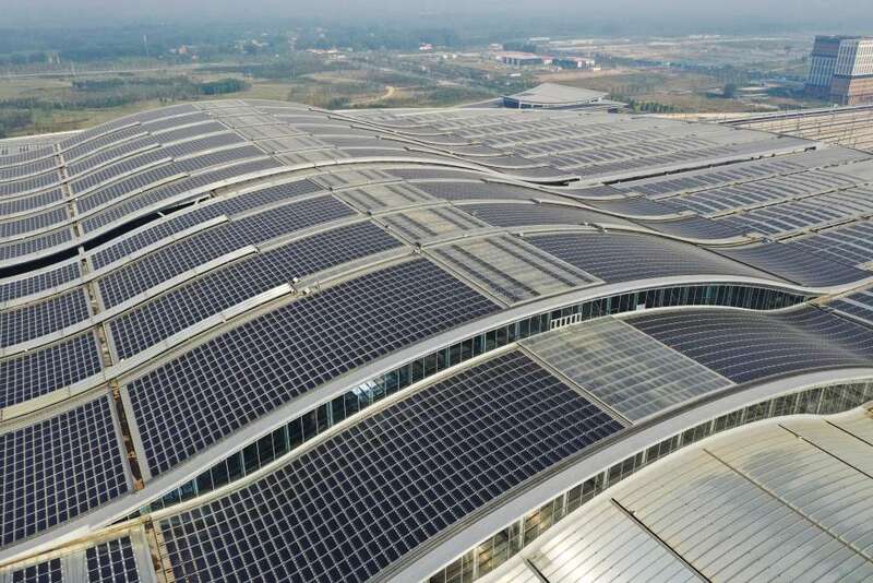 雄安站站顶分布式光伏电站,电站采用自发自用、余电上网模式(2022年9月9日摄,无人机照片)。