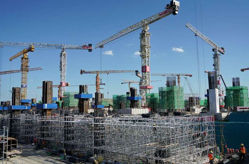 塔吊林立的雄安站建设工地(2019年8月29日摄)。