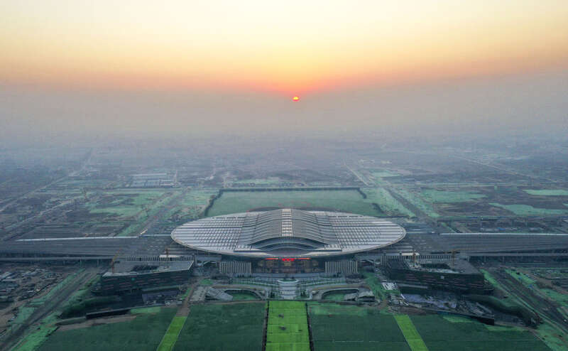 雄安站全貌(2021年4月1日摄,无人机照片)。