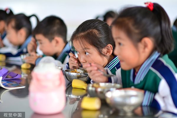 2023年5月11日,内蒙古鄂尔多斯,在伊金霍洛旗第四小学餐厅,学生享用营养午餐。