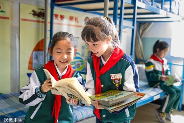 2023年5月11日,内蒙古鄂尔多斯,在伊金霍洛旗第四小学学生公寓,用完午餐的学生阅读课外读物。