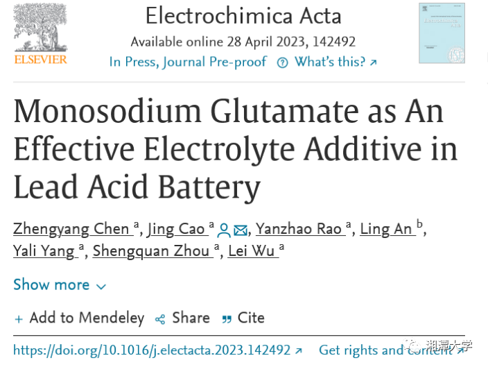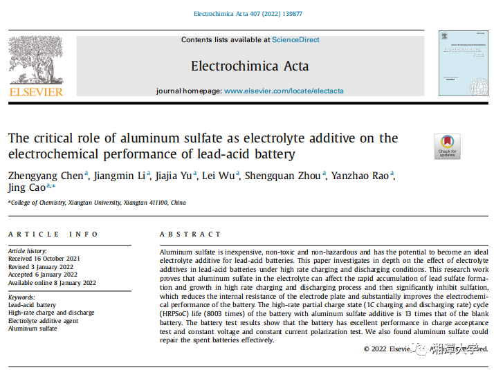 5月5日,2020级材料化学本科生陈正阳以第一作者身份在JCR一区Top期刊《电化学学报》(Electrochimica Acta影响因子IF=7.33)上发表研究成果《谷氨酸钠作为铅酸电池电解质有效添加剂》(Monosodium Glutamate as An Effective Electrolyte Additive in Lead Acid Battery),这是陈正阳以第一作者身份发表的第3篇JCR一区期刊论文。