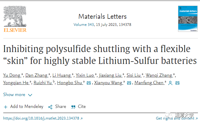 4月13日, 2020级化学类韶峰班本科生董宇以独立第一作者在SCI期刊《材料快报》(Materials Letters,影响因子IF: 3.574)发表论文《柔性“皮服”抑制多硫化物穿梭打造高稳定性锂硫电池》(Inhibiting polysulfide shuttling with a flexible “skin” for highly stable Lithium-Sulfur batterie)。