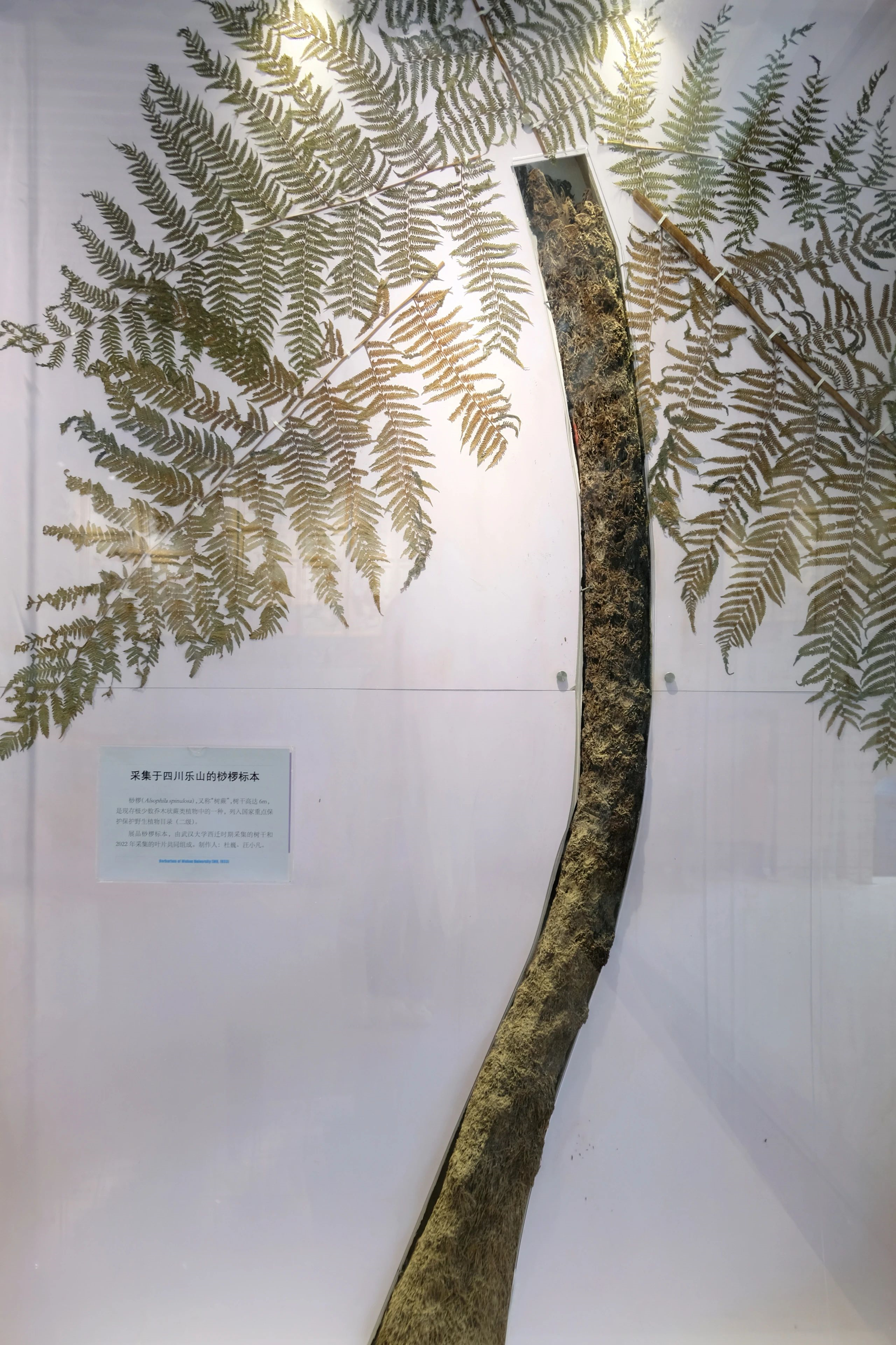 在展厅的西北角,巨型桫椤高约2米的树干,就采自西迁时期的乐山。桫椤又称“树蕨”,国家二级保护植物,树干最高可达6米,叶片长度实际可达3米,是现存极少数乔木状蕨类之一,饱经风霜而不倒,堪称植物中的“活化石”。这份大型标本的叶片是特地到峨眉山原址采回,西迁时期的树干与新采集桫椤叶片巧妙拼接,重现了桫椤“树蕨”的挺拔雄壮。