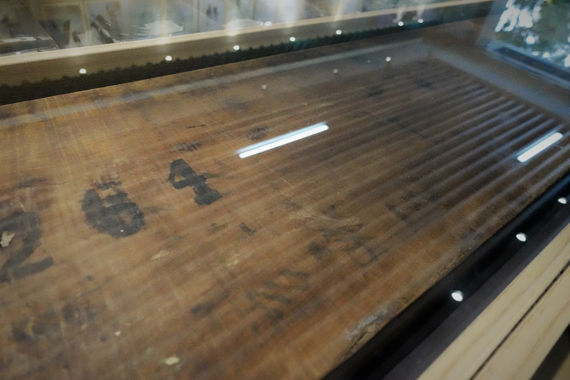 在展厅中央,摆放着一块长4m、重60公斤的楠木。这是标本馆的镇馆之宝,于1938年收集自乐山的一座寺庙。楠木上的标识历经风雨沧桑依旧清晰,我们可以看到武汉大学校徽和“生物系”“264”等字样。斑驳的漆印,揭开武汉大学标本馆的历史,诉说着武大人的坚韧与勇毅。