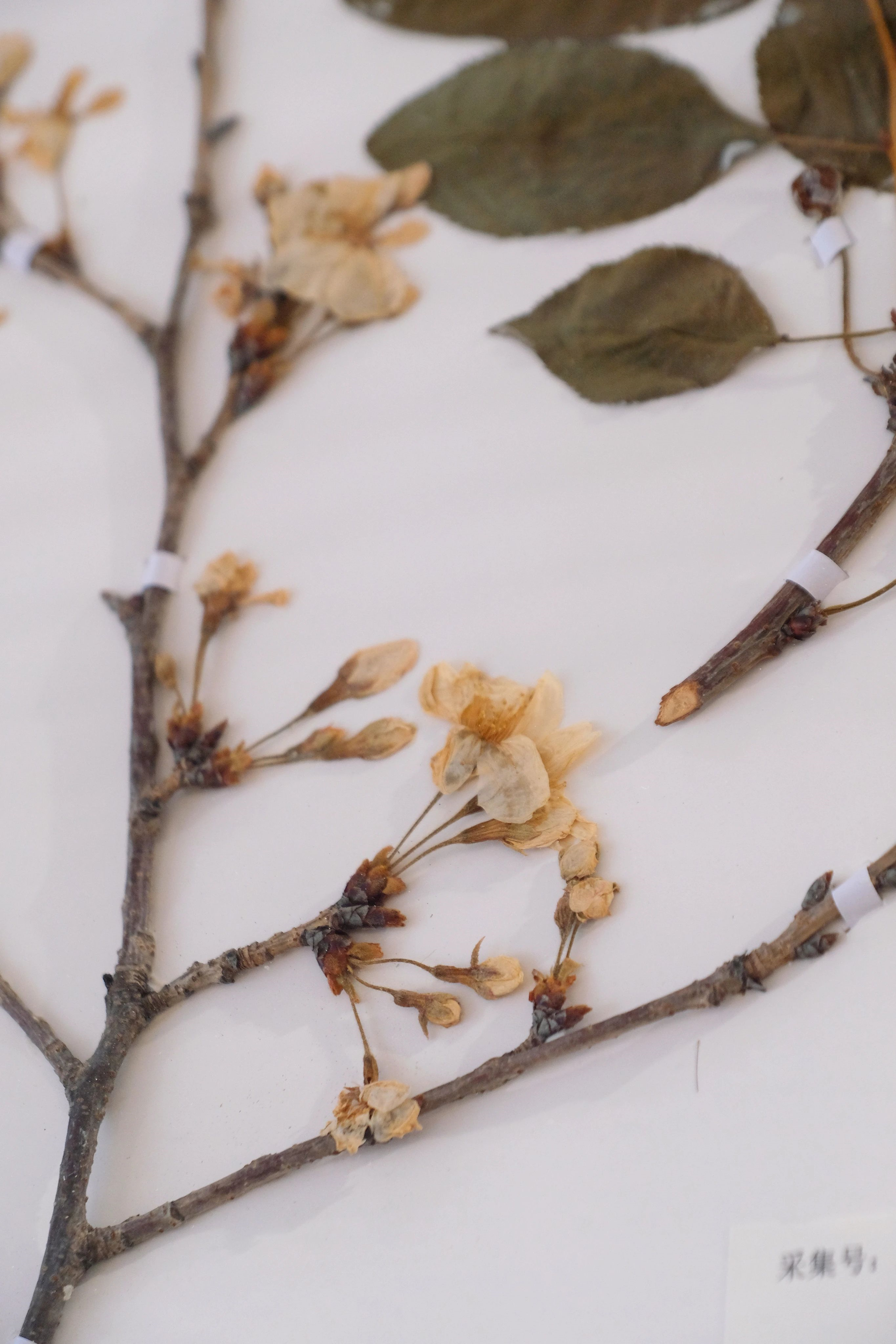 采花、捻枝、寻果、压制……为了定格每一种樱花绽放的姿态与生机,植物学科的学生们在春日的校园里寻觅和等待,开一种,采一种。先采集每种的花,等长出叶子结了果,再去采集带叶或带果的枝条,将其带回,烘干压制;最后把花和枝条一一组合,还原出樱花盛开时的繁荣与惊艳。短暂的花期被恒久延续,珞樱嫣然在他们手中被留存,不再易逝。