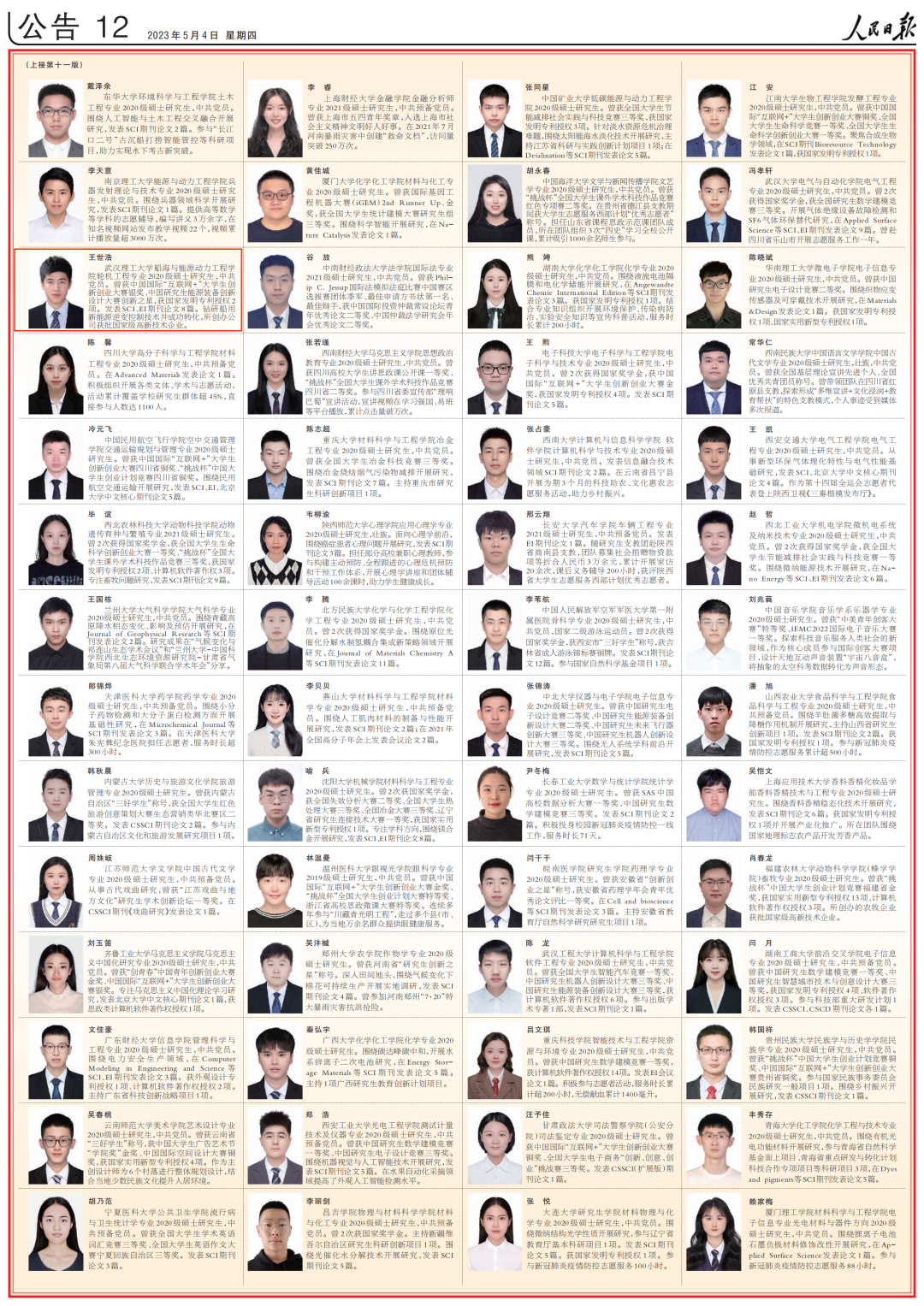 5月4日出版的《人民日报》,用六个整版刊登了100名研究生国家奖学金获奖学生优秀代表、100名本专科生国家奖学金获奖学生优秀代表和100名中等职业教育国家奖学金获奖学生优秀代表名录。其中,我校船海与能源动力工程学院2020级硕士研究生王世浩榜上有名。