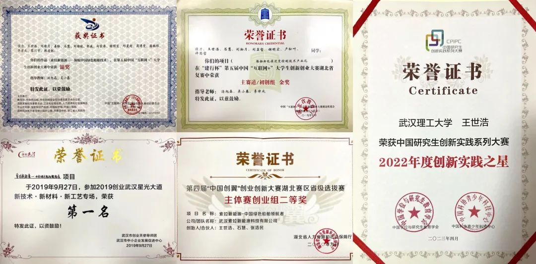 经过6年艰苦创业,公司获批国家级高新技术企业,荣获创客中国优秀企业、大学之城双创大赛冠军以及2019创业武汉星光大道“三新”科技成果专场赛冠军等众多奖项,展现了当代大学生的创新创业潜力。公司与武汉理工大学新能源船舶团队共建洪山区校企合作产学研平台,多次受邀参加大学生创新创业扶持计划研讨会。