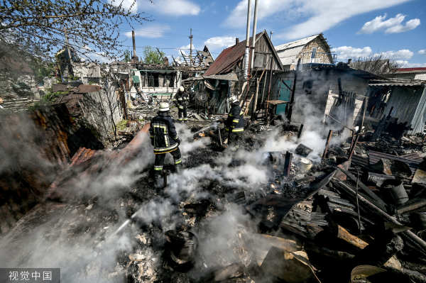 当地时间2023年5月11日,扎波罗热地区马洛卡特里尼夫卡,消防队员正在扑灭房屋废墟上的大火。