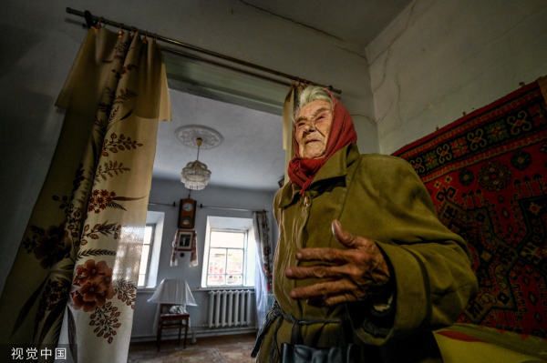 当地时间2023年5月11日,扎波罗热地区马洛卡特里尼夫卡,MLRS多管火箭炮袭击后,一名老年妇女在屋内。