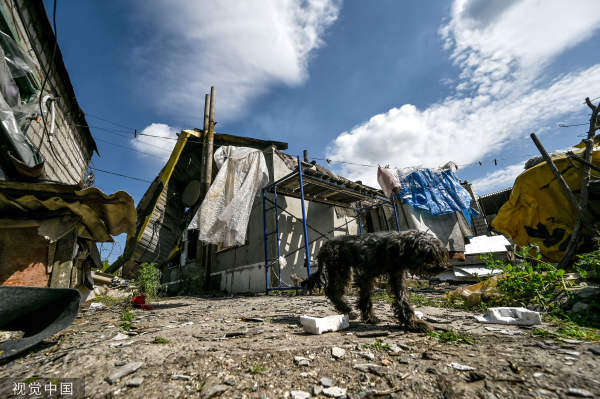 当地时间2023年5月11日,扎波罗热地区马洛卡特里尼夫卡,一只狗在MLRS多管火箭炮袭击中被摧毁的建筑物外。