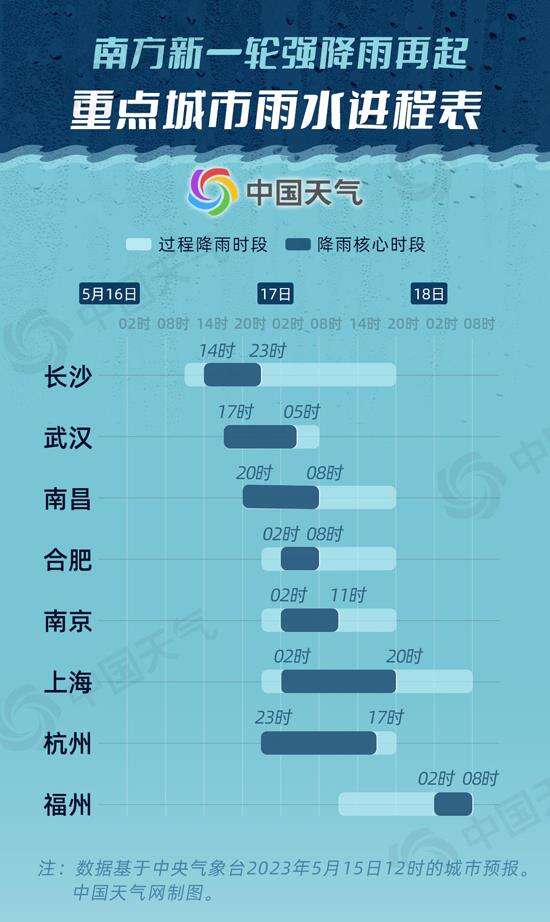 从中国天气网推出的重点城市雨水进程表可以看出,长沙、武汉的降雨从明天白天就会陆续展开,降雨核心时段出现在明天下午到晚上。南昌、合肥、南京、上海和杭州的降雨都会在明天晚上开始,其中南昌的降雨核心时段集中在明天晚上,合肥、南京、上海和杭州集中在后天白天。福州由于处在最东边,因此降雨核心时段最晚,主要集中在18日上午。