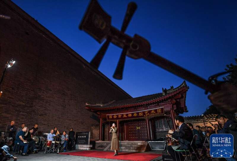 ↑2023年5月12日,西安市玉祥秦腔艺术团成员在西安城墙玉祥门外表演秦腔。新华社发(邹竞一 摄)